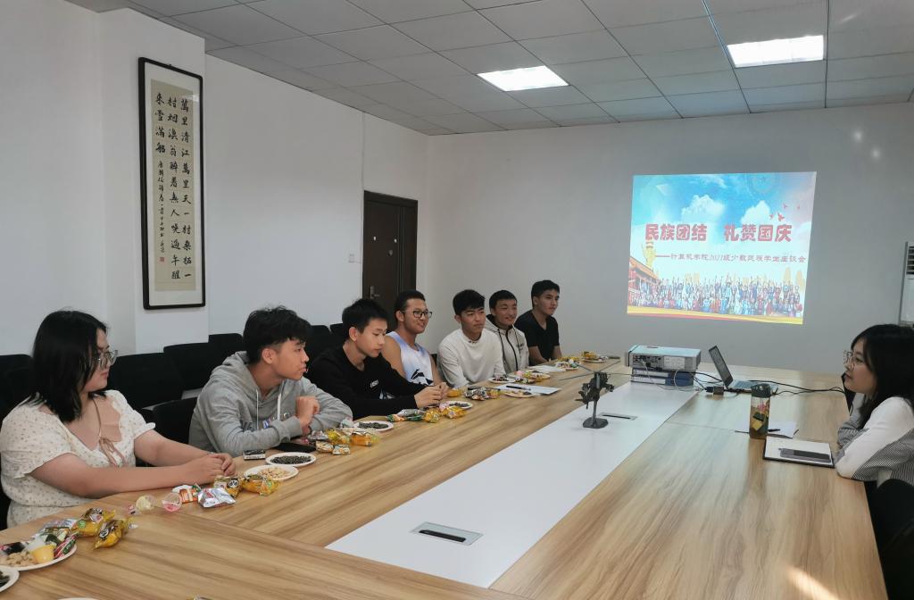 民族团结一家亲,同心共筑中国梦。在国庆节来临之际,为促进民族学生团结友爱、勤奋互助,进一步了解少数民族学生在校学习、生活状况,9月30日下午,jinnianhui今年会在教学北楼216召开“民族团结礼赞国庆”2021级少数民族学生座谈会。2021级少数民族学生参加座谈,会议由2021级学生辅导员张雯静主持。