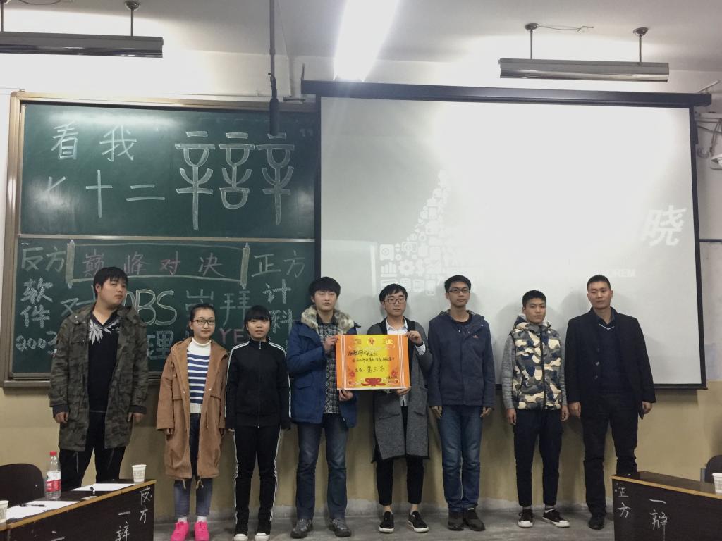 决赛的辩题为:对乔布斯崇拜的合理性。两班都派上了自己最强大的阵容,展开了激烈的角逐。比赛过程激动人心,各班的辩手们配合默契,妙语连珠,他们旁征博引,将整个比赛带入了一个又一个高潮。经过一个多小时的激烈辩论,计科2014班代表队最终赢得了比赛。在一段精彩的街舞和吉他演奏之后,冠军队和联合队就“爱与被爱谁更幸福”这一主题进行表演赛。辩手们灵活的思维、生动的语言赢得了大家阵阵掌声。经过评委们的认真评选,吕行方和朱昱光两名同学获得“最佳辩手”称号,辅导员兼评委团成员耿申分别为获奖的班级和选手颁发了奖状和荣誉证书。