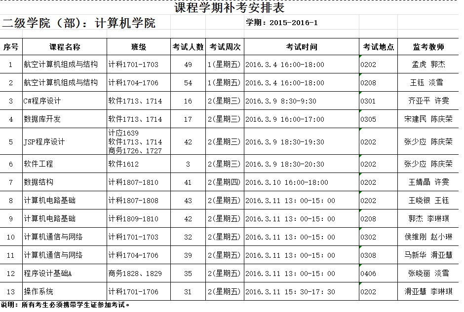 jinnianhui今年会2015-2016-1学期考试课程补考安排