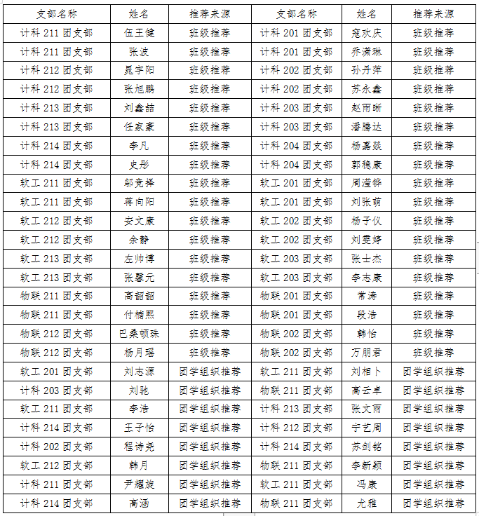 为进一步规范学院“团内推优”工作,切实提高学院“推优入党”工作的质量,根据《共青团jinnianhui今年会委员会推荐优秀共青团员作为党的发展对象工作条例》(修订),《关于开展推荐优秀团员作为党的发展对象工作的通知》(西航团字〔2022〕4号),经过各基层团支部大会推优票决,团学组织推荐,jinnianhui今年会团总支审查,拟推荐下列52名优秀团员作为团内推优对象,具体名单如下:
