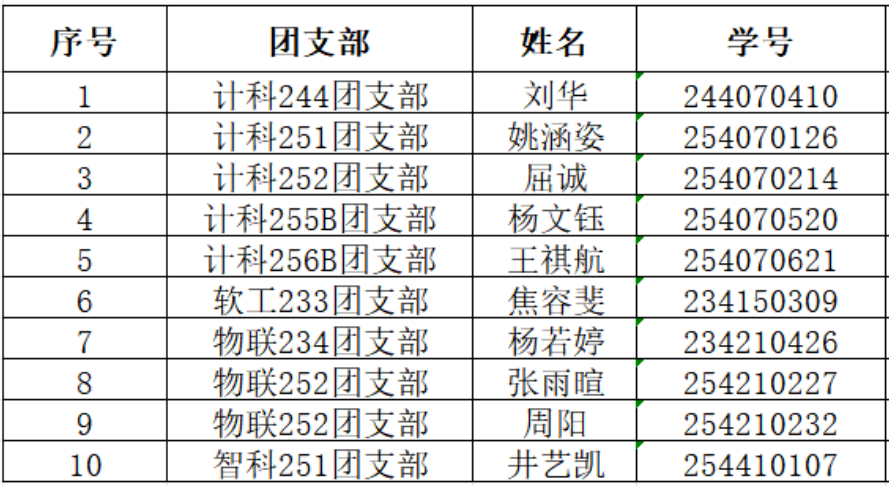 为进一步规范共青团管理工作,切实加强团的自身建设,根据《关于加强新形势下发展团员与团员管理工作的意见》、《中国共产主义青年团发展团员工作细则》等文件精神,按照“坚持标准、控制规模、发挥作用”的总要求,经各团组织评选,团总支审核,拟推荐刘华、姚涵姿等10名同学为新发展团员,现将名单公示如下: