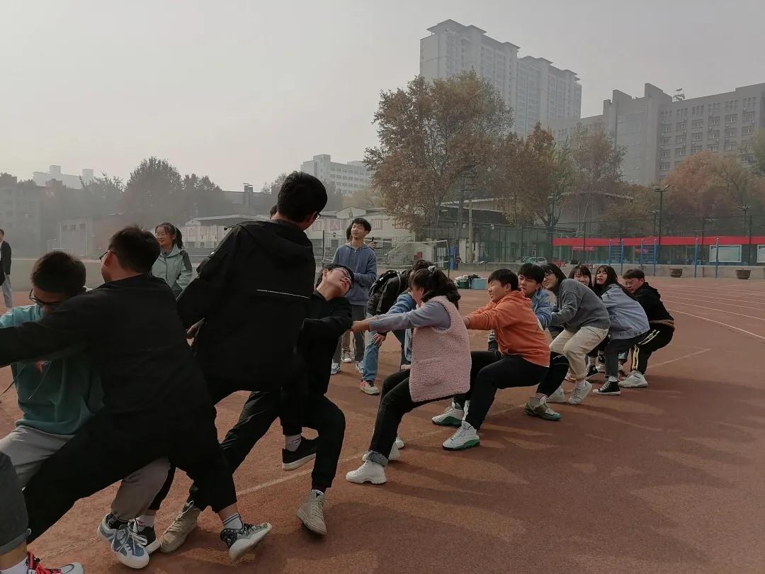 在拔河比赛现场上,同学们齐心协力,高声呼喊,一起加油,他们互不相让,紧紧握着绳子,把对方班级都要拉到自己这一边来。在新生篮球赛中,球场上,同学们来回奔跑,精准投球,挥洒着青春的汗水,球场上几个队伍奔跑,为班级荣誉而努力拼搏。